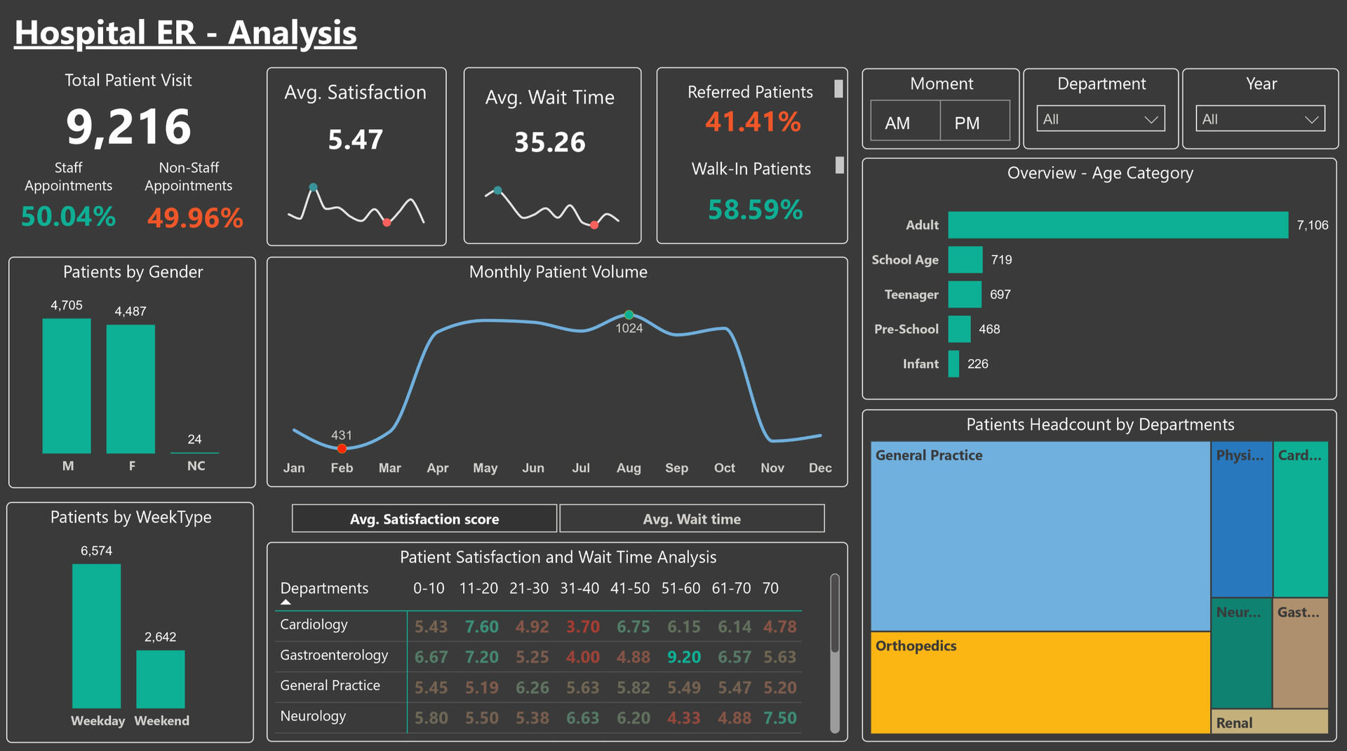 3. Created interactive visualizations in Power BI to analyze wait times, satisfaction scores, and patient trends.