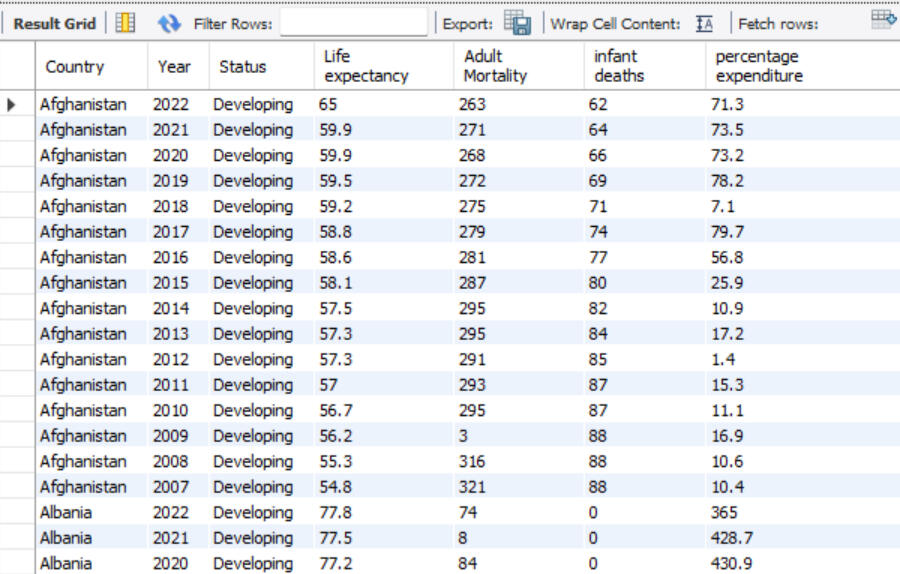 2. Identified missing values and imputed them using self-joins (e.g., filling in missing life expectancy values by averaging previous and next years)